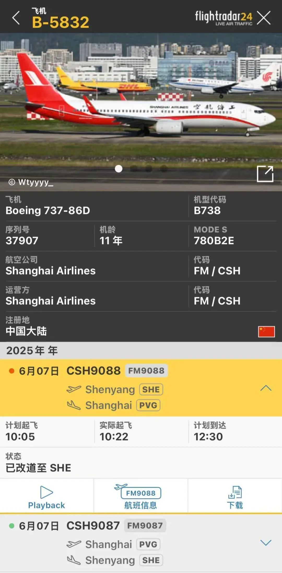 另外根据飞常准数据,该航班由737-800机型(注册号B5832)执行,前序浦东-沈阳正常。返航后,等待更换飞机,一直到B1742抵达沈阳后,于6月7日18时05分再次起飞,并于19时53分成功到达上海浦东机场,总共延误了7小时23分钟。